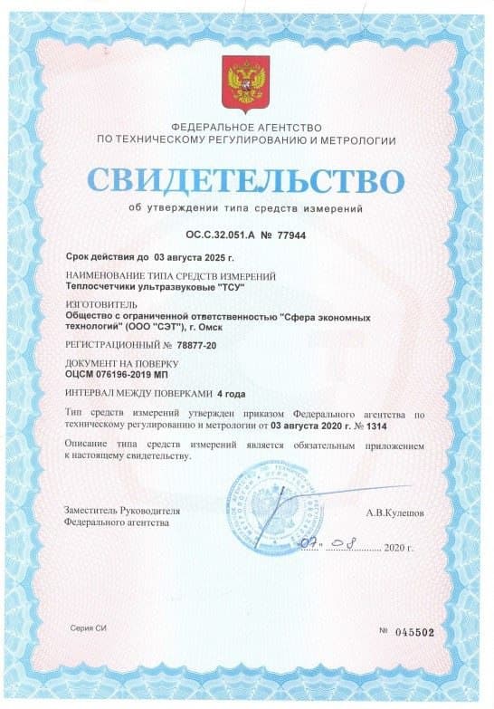 Теплосчетчики изготовлены по техническим условиям СЭТ.469333.147 ТУ и включены в Государственный реестр средств измерений за № 78877-20.