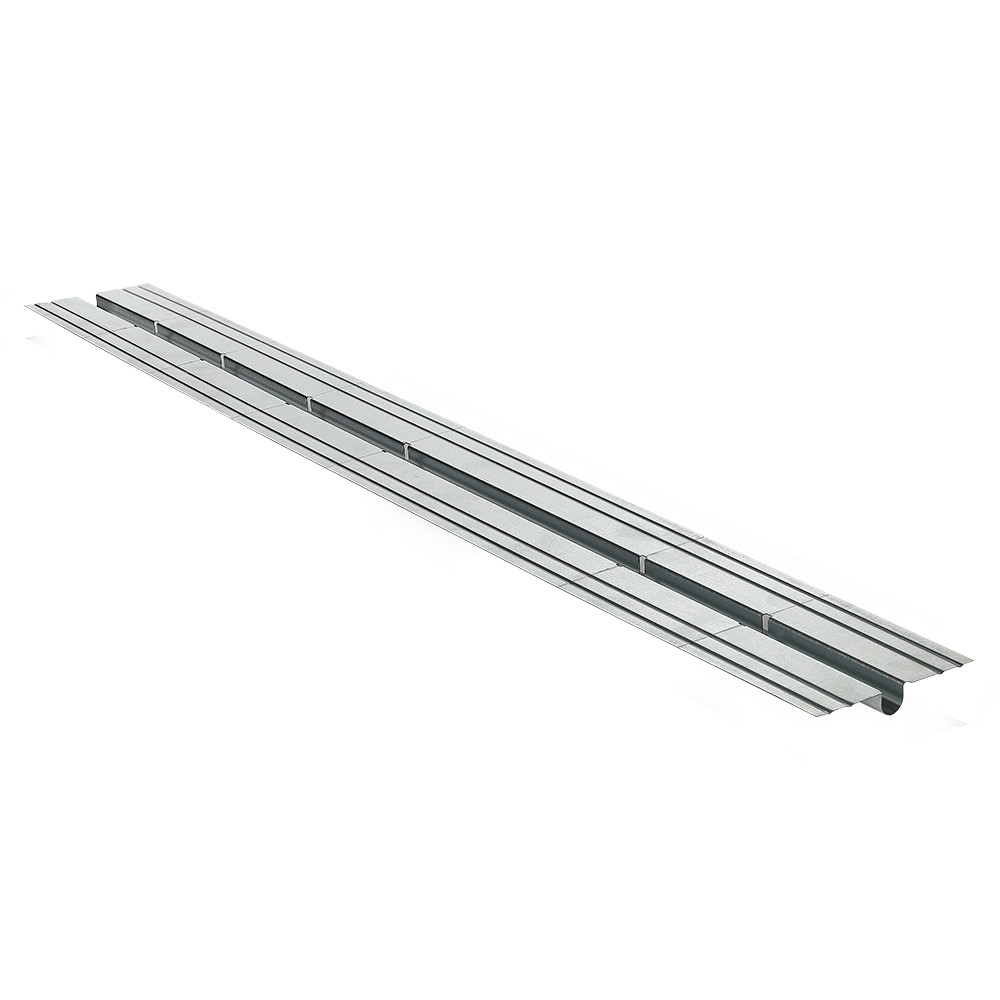 (VT.FP.SZ) Теплораспределительная пластина для систем теплого пола без бетонной стяжки («сухой» способ монтажа). Материалом изделия служит оцинкованный стальной лист, в котором сформированы омегаобразный канал для нагревательной трубы диаметром 16 мм и четыре ребра жесткости, усиливающих конструкцию и компенсирующих тепловое расширение. От плотно охваченной трубы металл передает тепло расположенному сверху напольному покрытию, обеспечивая его равномерный прогрев. Длина пластины – 1000, ширина и, соответственно, минимальный шаг укладки трубы – 125 мм.
